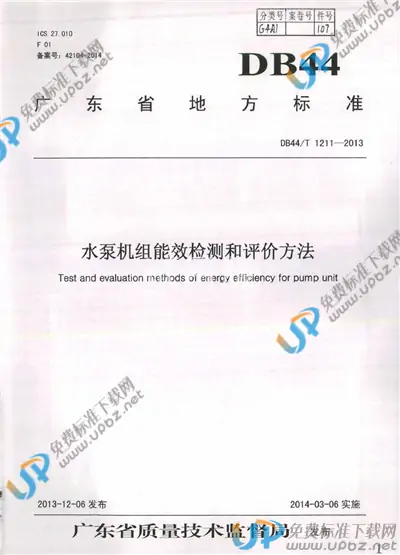 地方标准《水泵机组能效检测和评价方法》由广东省质量技术监督局归口上报,主管部门为广东省质量技术监督局。本标准适用于电动机驱动的各种水泵,但不适用于潜水电泵