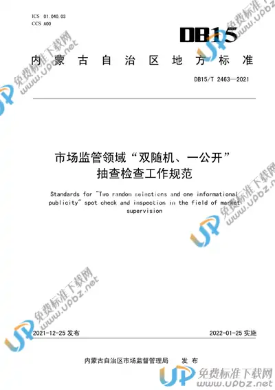 DB3212/T1028-2020优化营商环境市场监管领域“双随机、一公开”监管工作规范DB4202/T7.2-2020市场监管领域“双随机、一公开”监管工作规范第2部分:单一部门随机抽查DB4202/T7.1-2019市场监管领域“双随机、一公开”监管工作规范第1部分:总则DB3305/T138-2020市场监管领域疫情防控指南DB5106/T10-2020“双随机、一公开”监管工作规范DB4210/T39-2020“双随机、一公开”监管工作规范DB13/T5257-2020“双随机、一公开”监管工作规范DB1301/T336-2020“双随机、一公开”监管工作规范DB22/T3218-2021"双随机、一公开"监管工作规范DB3401/T223—2021“双随机、一公开”监管工作规范
