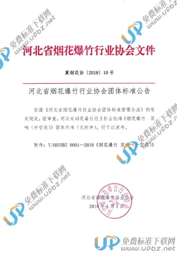 T/HBYHBZ 0001-2018 河北省烟花爆竹行业协会关于批准发布《烟花爆竹 双响(升空类)》团体标准的公告