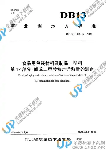 DB 13/T 1081.12-2009 食品用包装材料及制品 塑料 第12部分:间苯二甲胺特定迁移量的测定