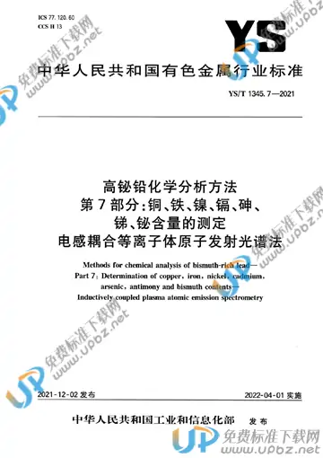 YS/T 1345.7-2021 高铋铅化学分析方法 第7部分:铜、铁、镍、镉、砷、锑、铋含量的测定 电感耦合等离子体原子发射光谱法