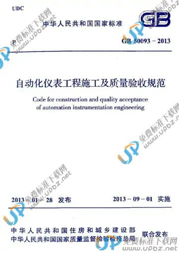本规范由中华人民共和国住房和城乡建设部第1630号公告批准,编号为GB50093-2013,自2013年9月1日实施。其中有20条(款)为强制性条文,必须严格执行。原国家标准《自动化仪表工程施工及验收规范》GB 50093-2002 自动化仪表工程施工及验收规范和《自动化仪表工程施工质量验收规范》GB 50131-2007 自动化仪表工程施工质量验收规范同时废止。本规范共分13章和2个附录。主要技术内容是:总则、术语、 基本规定、仪表设备和材料的检验及保管、取源部件安装、仪表设备安装、仪表线路安装、仪表管道安装、脱脂、电气防爆和接地、防护、仪表试验、工程交接验收等。本规范适用于自动化仪表工程的施工及质量验收。本规范不适用于制造、贮存、使用爆炸物质的场所以及交通工具、矿井井下等自动化仪表安装工程。本规范面向自动化仪表工程的施工及质量验收人员。