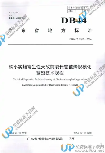 DB44/T 1318-2014 橘小实蝇寄生性天敌前裂长管茧蜂规模化繁殖技术规程
