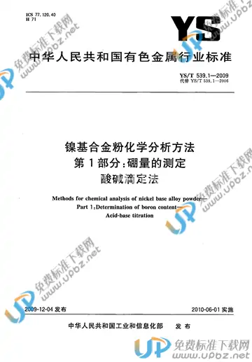 行业标准《镍基合金粉化学分析方法 第1部分:硼量的测定 酸碱滴定法》由全国有色金属标准化技术委员会归口上报,主管部门为工业和信息化部。YS/T 539的本部分规定了镍基合金粉中硼含量的测定方法。本部分适用于不含钨、钼的镍基合金粉中硼量的测定,测定范围:1%-6%。