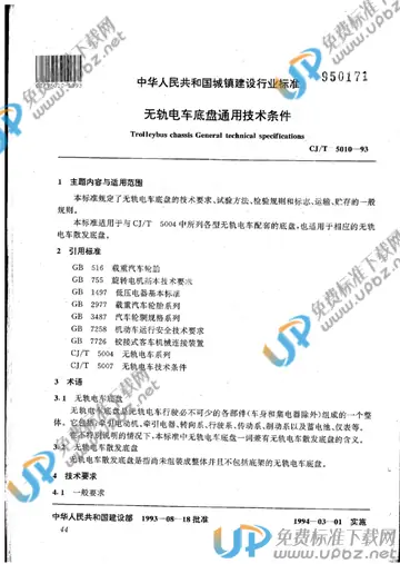 CJ/T 5010-1993 无轨电车底盘通用技术条件