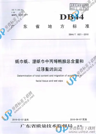 DB44/T 1821-2016 纸巾纸、湿纸巾中丙烯酰胺总含量和迁移量的测定