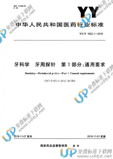 行业标准《牙科学 牙周探针 第1部分:通用要求》由全国口腔材料和器械设备标准化技术委员会齿科设备与器械分技术委员会归口上报,主管部门为国家食品药品监督管理局。本标准规定了牙周探针的通用要求及试验方法。本标准适用于由奥氏体不锈钢或马氏体不锈钢制成的牙周探针。本标准不适用于工作端完全由塑料制成的牙周探针,也不适用于豪尔(HAUER)探针和具有可设定探测力的牙周探针。