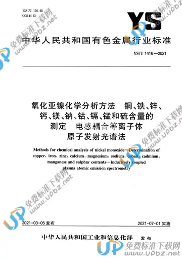 YS/T 1416-2021 氧化亚镍化学分析方法 铜、铁、锌、钙、镁、钠、钴、镉、锰和硫含量的测定 电感耦合等离子体原子发射光谱法