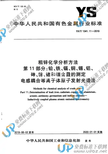 YS/T 1341.11-2019 粗锌化学分析方法 第11部分:铅、铁、镉、铜、锡、铝、砷、锑、锗和铟含量的测定 电感耦合等离子体原子发射光谱法