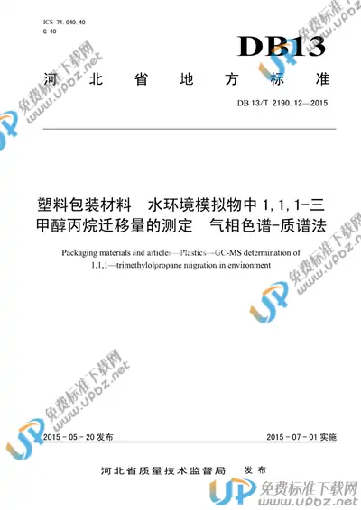 地方标准《塑料包装材料 水环境模拟物中1,1,1-三甲醇丙烷迁移量的测定 气相色谱-质谱法》,主管部门为河北省质量技术监督局。