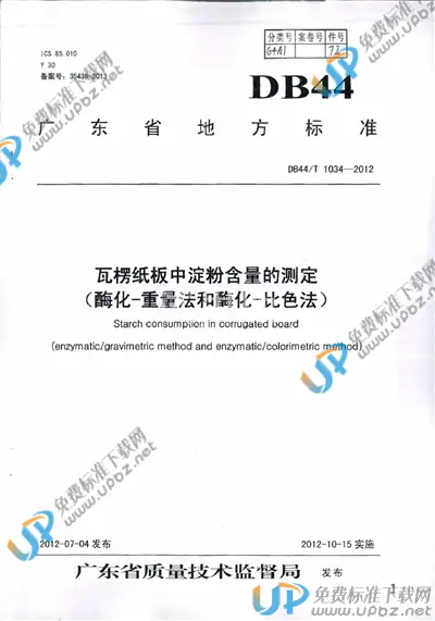 地方标准《瓦楞纸板中淀粉含量的测定(酶化-重量法和酶化-比色法)》由广东省造纸及纸制品标准化技术委员会归口上报,主管部门为广东省质量技术监督局。本标准规定了单位面积上瓦楞纸板淀粉含量的两种测定方法—酶化-重量法和酶化-比色法。 本标准适用于未经涂布处理的瓦楞纸板。