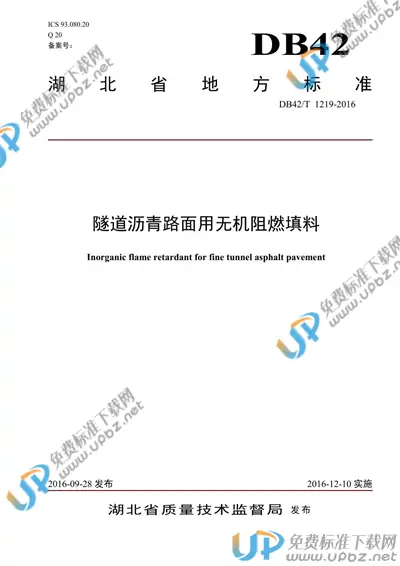 地方标准《隧道沥青路面用无机阻燃填料》由湖北省产品质量监督检验研究院归口上报,主管部门为湖北省质量技术监督局。遂道沥青路面用无机阻燃填料