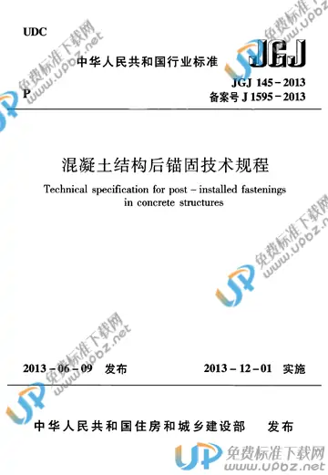 住房和城乡建设部关于发布行业标准《JGJ145-2013 混凝土结构后锚固技术规程 》的公告 现批准《JGJ145-2013 混凝土结构后锚固技术规程 》为行业标准,编号为JGJ 145-2013,自2013年12月1日起实施。其中,第4.3.15条为强制条文,必须严格执行。原《JGJ 145-2004 混凝土结构后锚固技术规程 混凝土结构后锚固技术规程 》同时废止。