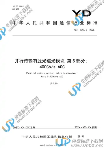 YD/T2796.4-2020并行传输有源光缆光模块第4部分:200Gb/sAOCYD/T2796.1-2015并行传输有源光缆光模块第1部分:4x10Gb/sAOCYD/T2796.3-2018并行传输有源光缆光模块第3部分:4×25Gb/sAOCYD/T2796.2-2016通信用并行传输有源光缆光模块第2部分:12x10Gb/sCXPAOCYD/T3537-2019通信有源光缆(AOC)用线缆YD/T3538.3-2020400Gb/s强度调制可插拔光收发合一模块第3部分:4×100Gb/sYD/T3783-2020N×400Gb/s光波分复用(WDM)系统技术要求YD/T3786-2020N×400Gb/s光波分复用(WDM)系统测试方法YD/T2799.4-2021集成相干光接收器技术条件第4部分:400Gb/s20141892-T-469晶片承载器传输并行接口要求