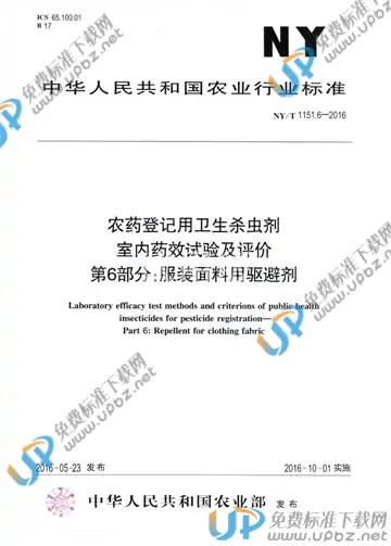 - 标准名称:农药登记用卫生杀虫剂室内药效试验及评价 第6部分:服装面料用驱避剂