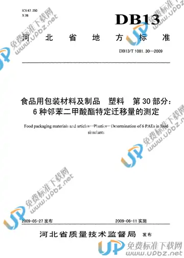 DB 13/T 1081.30-2009 食品用包装材料及制品 塑料 第30部分:6种邻苯二甲酸酯特定迁移量的测定