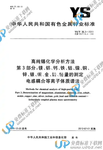YS/T 36.3-2011 高纯锡化学分析方法 第3部分:镁、铝、钙、铁、钴、镍、铜、锌、银、铟、金、铅、铋量的测定 电感耦合等离子体质谱法